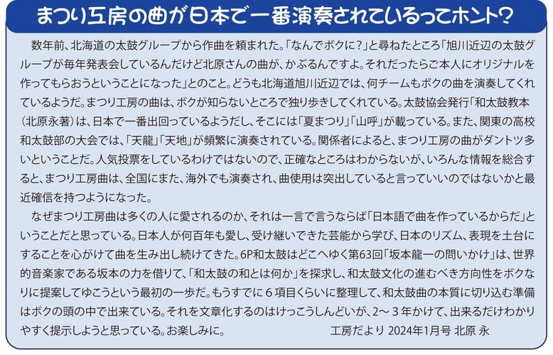 まつり工房創作曲は、そうした先人の創造を受け継ぎ、より現代に通用する表現へと高めたものです。もちろん、どの曲もオリジナリティにあふれていますが、そこには確かに、過去の創造者たちの血肉が息づいています。そのような先人たちの創作活動へ思いをはせたとき、「まつり工房創作曲は、まつり工房のものであって、まつり工房のものではない」という思いに行き着くのです。