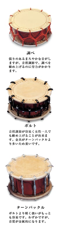 締太鼓は、リングに牛革を張り、胴とはさんで締め上げたものです。