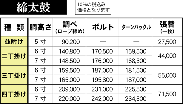 また、締太鼓だけを何台も並べ、音の高低を付けてメロデイーのように演奏することも出来ます。